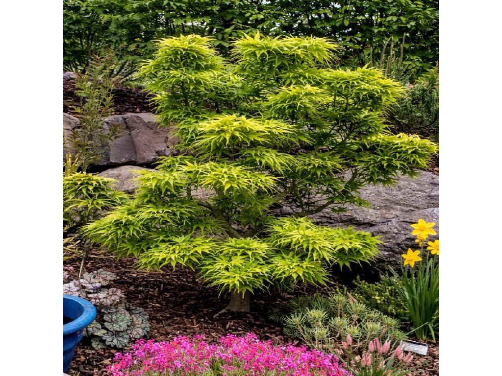 Tento pomaly rastúci strom dorastie do výšky 1,2 až 1,8 metra a šírky 1,2 metra a má viacrozvetvený tvar s hustým porastom. Vysádzajte ho v čiastočnom tieni až na plné slnko do vlhkej, dobre priepustnej, kyslej až neutrálnej pôdy. Je odolnejší voči teplu ako väčšina japonských javorov.Skoro na jar sú jeho listy žltozelené, v lete sa sfarbujú do stredne zelenej a na jeseň do žltozlatej farby, pričom zúbkované okraje vonkajších listov sú výrazne jasne červené.Je vhodná do malých plôch, nádob, ázijských a rozprávkových záhrad a často sa používa na pestovanie bonsajov.