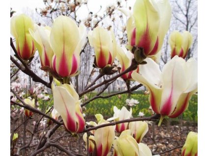 Magnólia ´Sunrise´ bola pravdepodobne vyšľachtená v Číne a je naozaj veľmi výnimočná. Kvety sú krémové až biele, majú tvar renesančného kalicha a zospodu každého okvetného lístka je výrazný ružovo-purpurový trojuholník, z ktorého špičky sa ťahá tenká linka až k vrchu lupeňa. Listy sú jasnozelené a oválne. Táto odroda magnólie rastie pomaly a vytvára ker kompaktného zaobleného tvaru. Výška je cca 2 m.