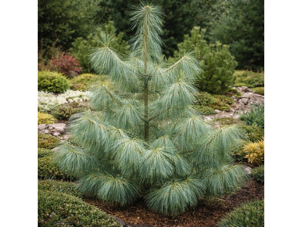 Koruna má v mladosti široko pyramidálny tvar, neskôr sa však veľmi rozkonári s horizontálne odstávajúcimi vetvami. Pri samostatne rastúcich jedincoch zasahujú konáre až k zemi. V prirodzenom prostredí môže tento strom dosiahnuť výšku až 50 m, pri pestovaní však býva menší. Kôra kmeňa je spočiatku hladká a tmavosivá, neskôr sa odlupuje v platniach. Modrozelené, matné ihlice sú mierne ohnuté, pozoruhodne dlhé a tenké a z mladých výhonkov vyrastajú priamo nadol. Mladé šišky sú vzpriamené, ale neskôr tiež previsnú. Dosahujú dĺžku 15 – 25 cm a hrúbku 3 – 5 cm. Najmä mladé jedince vyžadujú na exponovaných, veterných stanovištiach oporu a sú citlivé na mrazy. Toleruje suché podmienky.