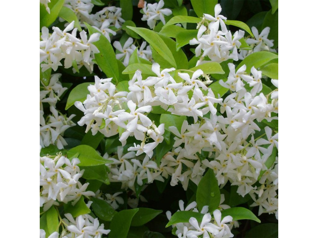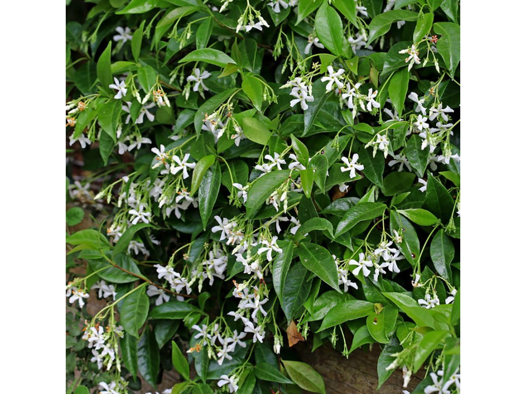 Hviezdicový jazmín , Trachelospermum jasminoides , je drevitá, vždyzelená popínavá rastlina s bohatými, tmavozelenými listami, ktoré sa v zime sfarbujú do bronzova. Od polovice do konca leta sa pestujú čisto biele, voňavé kvety. Môže sa pestovať pri stene v miernejších klimatických podmienkach alebo v skleníku či zimnej záhrade v oblastiach náchylných na silné mrazy.Pestujte Trachelospermum jasminoides v dobre priepustnej pôde na plnom slnku alebo v čiastočnom tieni s ochranou pred chladným, vysušujúcim vetrom. Ak pestujete vo vnútri, vysádzajte do hlinitého kvetináčového kompostu na plnom svetle, ale nie na priamom slnku. Počas vegetačného obdobia voľne zalievajte a aplikujte vyvážené tekuté hnojivo mesačne, v zime zalievajte striedmo.